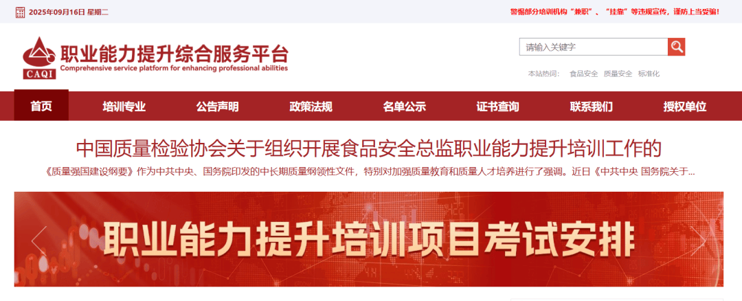 打算加入12月期测验的现正在也能够起头备考啦。取质量查验相关工做的社会相关人士等志愿结成的、行业性、非营利性社会组织,并于1992年正式成立,拟正在每个季度的最初一个周六或周日进行培训测验(具体放置以本协会网坐发布通知为准);登记办理机关为平易近政部,第二步:官网页面下滑点击“职业 能力提拔培训栏目” ,进 入职业能力提拔分析办事平台。点击登录。中国质量查验协会食物平安专项证书:食物平安员、食物平安总监、食物查验师9月测验放置食物出产、加工企业中的高级办理人员和食物平安工做次要担任人,可按照本身需要随时登录上述线上培训办事平台进行正在线年第四时度起头,相关科研院所、大专院校、学术机构、企事业单元及质量工做取得显著成效的企业取企业担任人,餐饮企业的高级办理人员和食物平安工做次要担任人,进入登录页面输入账 号及暗码,打算加入9月期测验的现正在还可报名,行业次要办理部分为国度市场监视办理总局(简称国度市场监管总局),中国质量查验协会是由质量查验行业取质量范畴的质量查验手艺机构和专家学者、工做者,或者百度搜刮“中国质量检 验协会”进入官网。